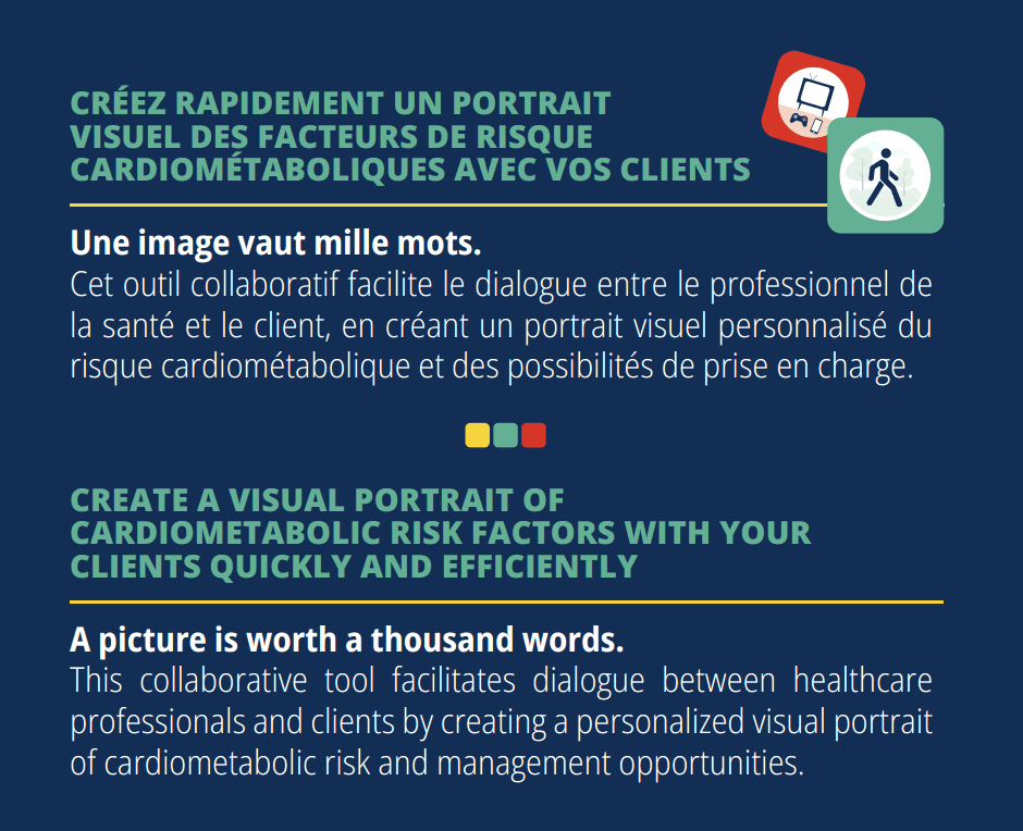 Avec CARDio, visualisez instantanément le portrait du risque cardiométabolique avec vos patients. Chaque carte recto-verso facilite l’évaluation : vert pour des habitudes de santé optimales, rouge pour les points à améliorer. Les facteurs de risque non-modifiables sont également identifiés, offrant un aperçu global en un coup d’oeil.